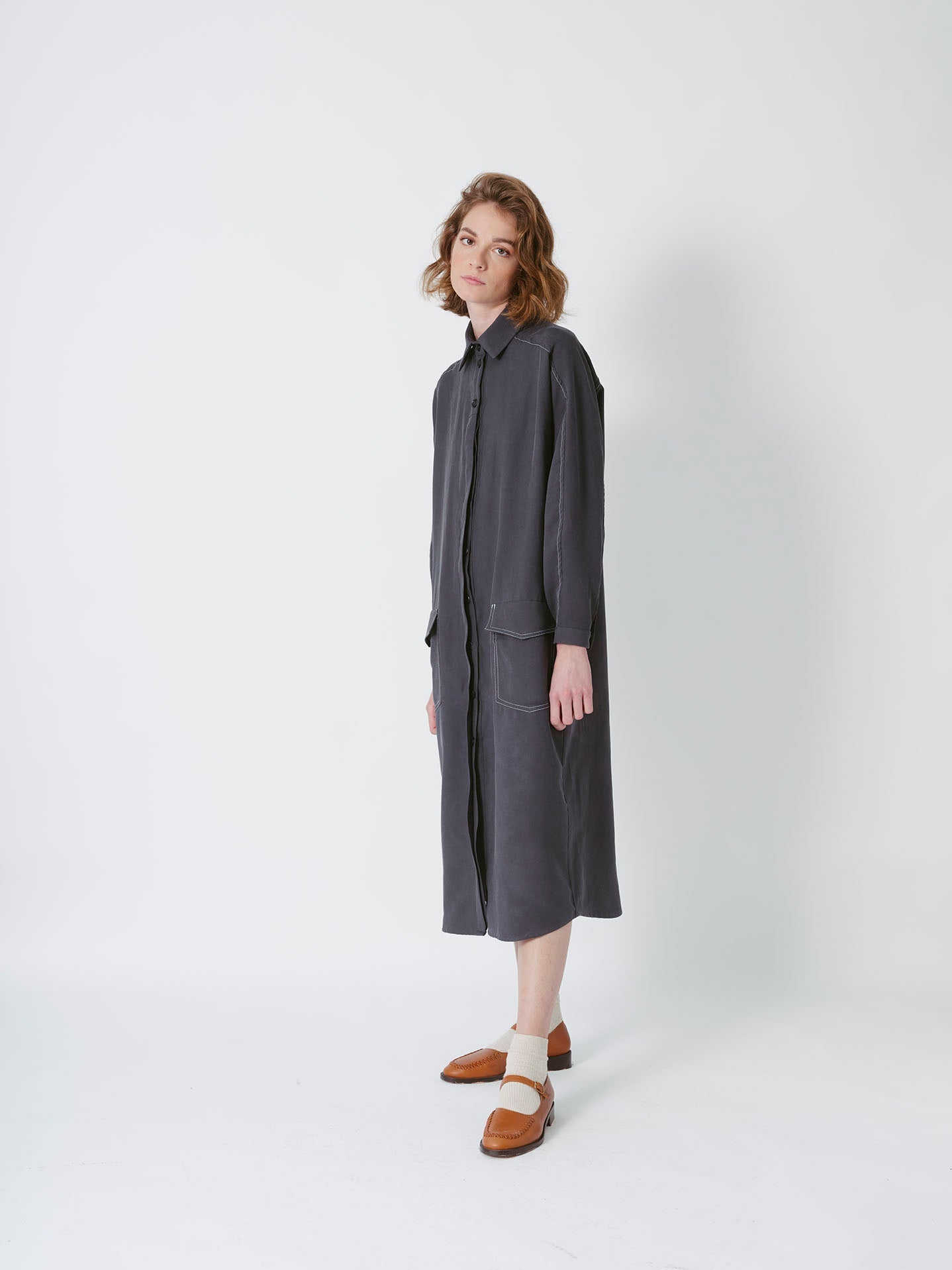 Turtleneck dress with buttons and pockets.